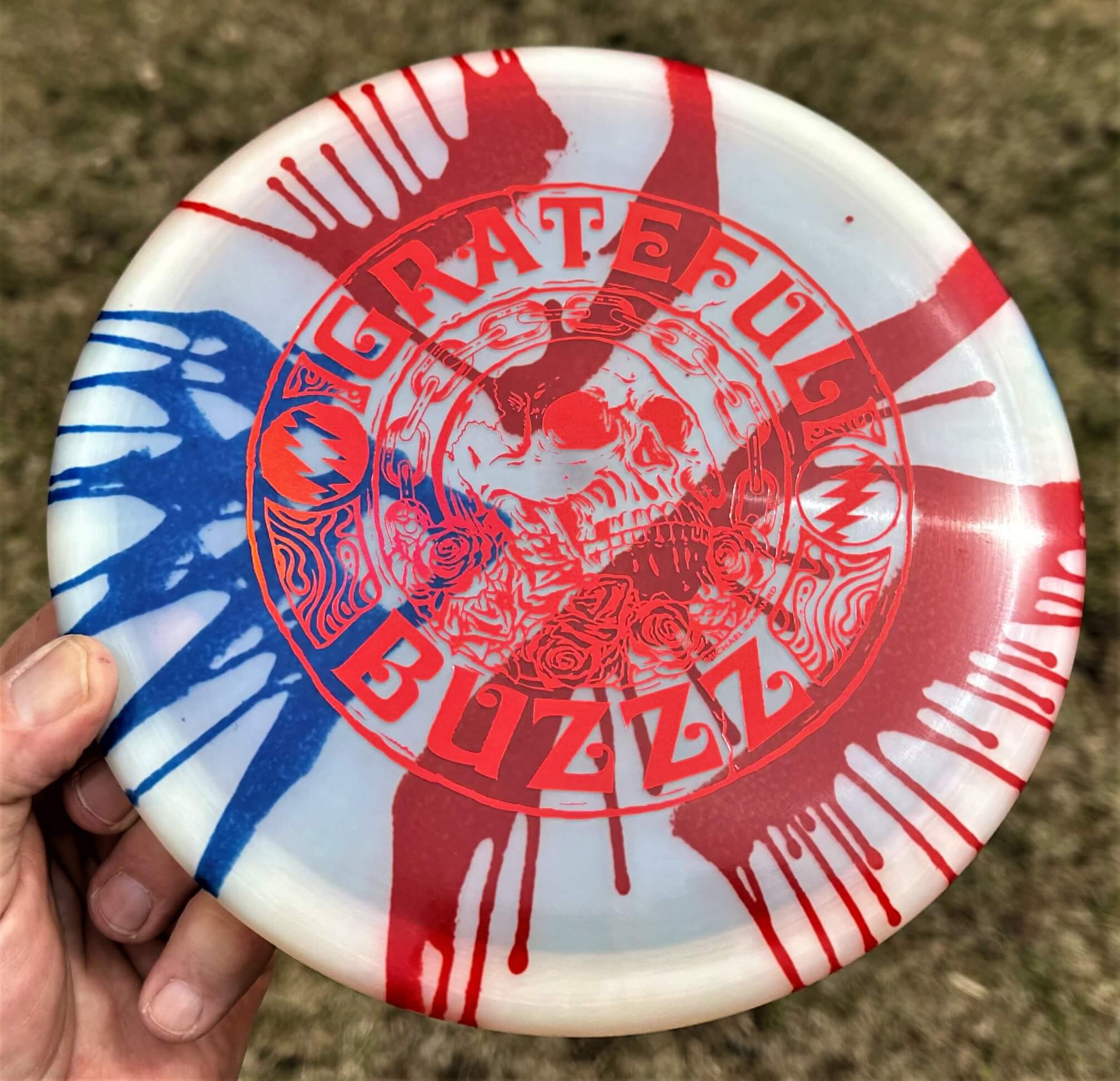 The Buzzz is the most popular disc on the market. It’s a dependable, straight-flying midrange with a consistent fade that holds any line you put it on. The Buzzz is a go-to for players of all skill levels. The Grateful Buzzz has always been an annual full foil run showing mind-blowingly intricate Michael Barnard art. This run has expanded to include a new special-edition Z Fly Dye run. This run features Discraft’s old-school Fly Dye with differentiating colors and tie-dye patterns like sunburst, spiral, bullseye, and Discraft’s signature flag dye. These were part of a run of 2900 Buzzzes.