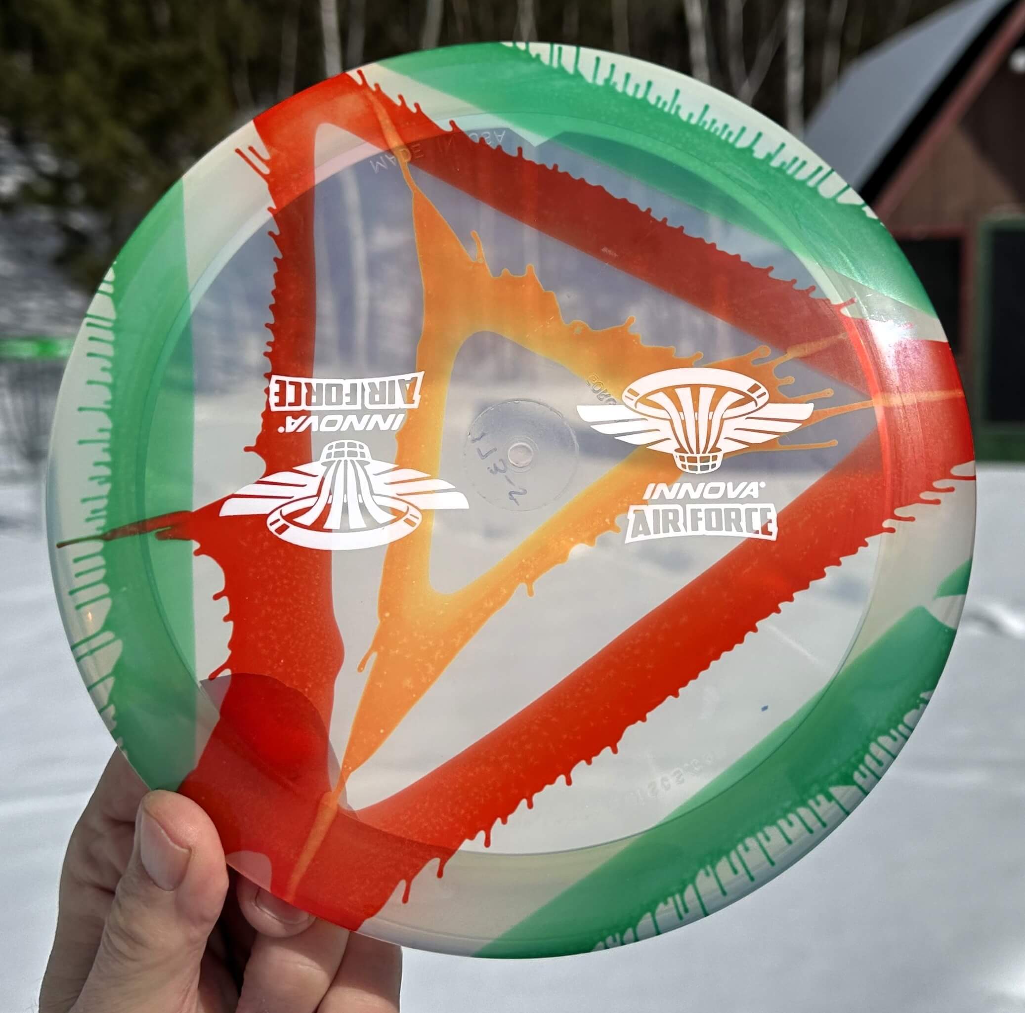 I-Dyed Champion Gorgon with double mini Innova Air Force stamp. Proceeds from the sale of these Air Force stamped discs will be added to the purse for the 31st Northwoods Open at Sandy Point Disc Golf Ranch Driven by Innova Discs.