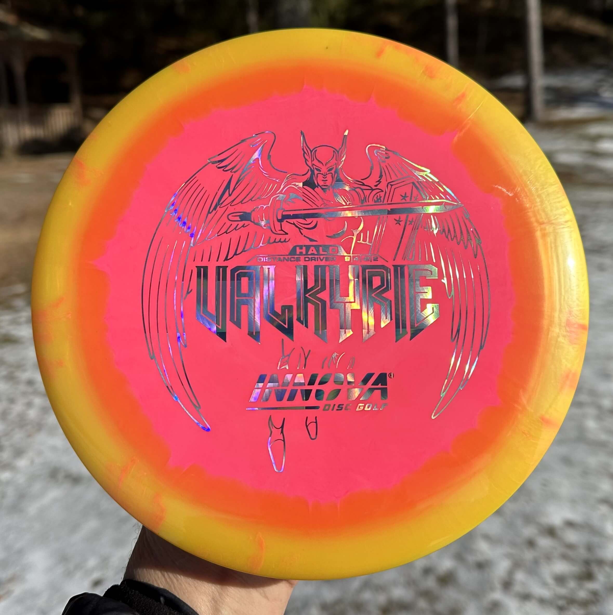 The Valkyrie is a turnover distance driver with great glide. A great choice for tailwind or downhill drives. In lighter weights the Valkyrie gives new players extra distance. Lighter weights also give players extreme range when thrown downwind, while maximum weights can give excellent upwind distance. The Valkyrie’s high speed turn and flight characteristics make it great choice for long range turnover shots and rollers.