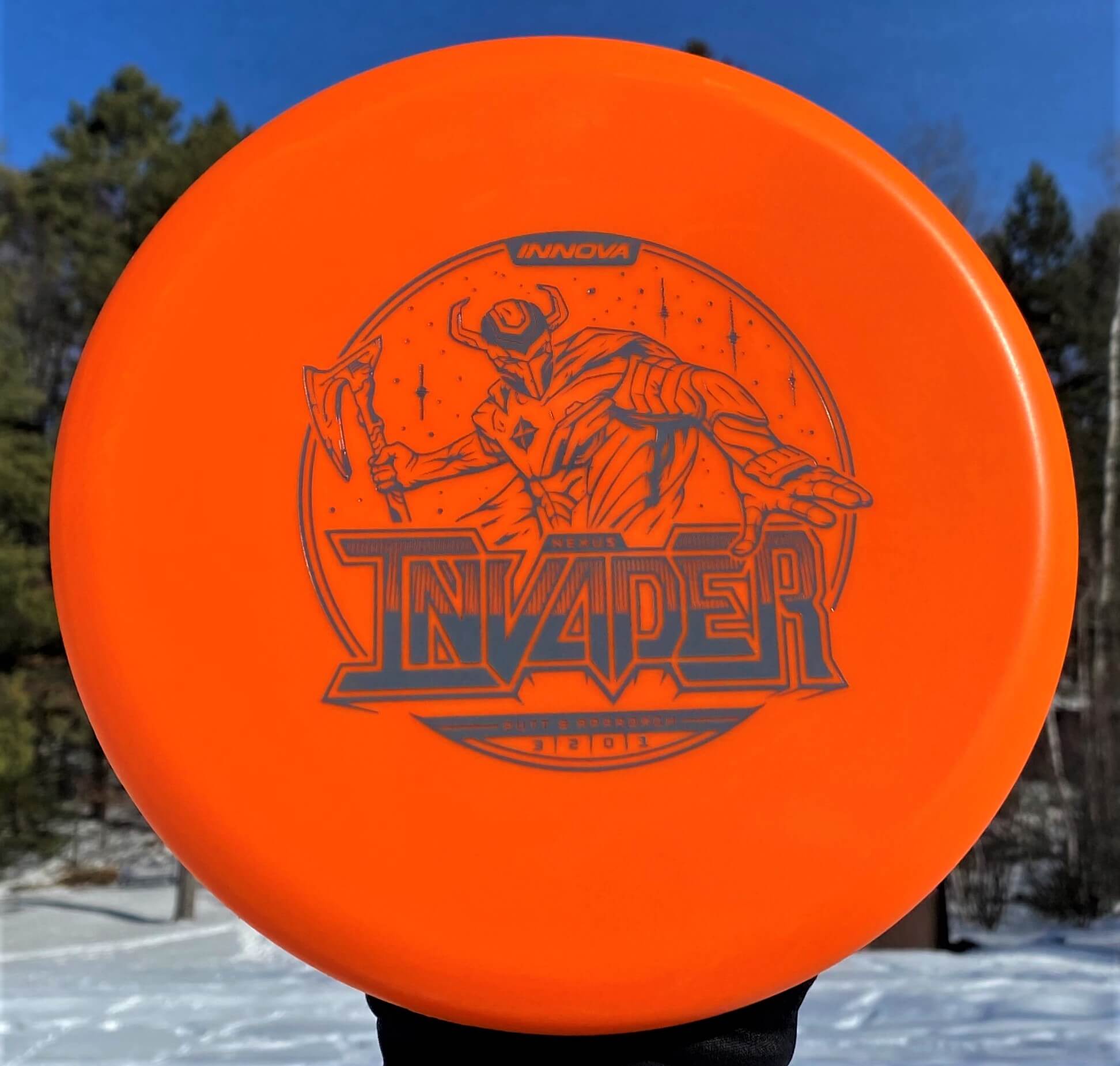 From Innova: “The Invader should be your approach workhorse. It features a flat-top and small bead that creates a comfortable in hand feel. The flatter top profile also reduces errant glide, allowing the player to power the disc to the correct distance for more control.”