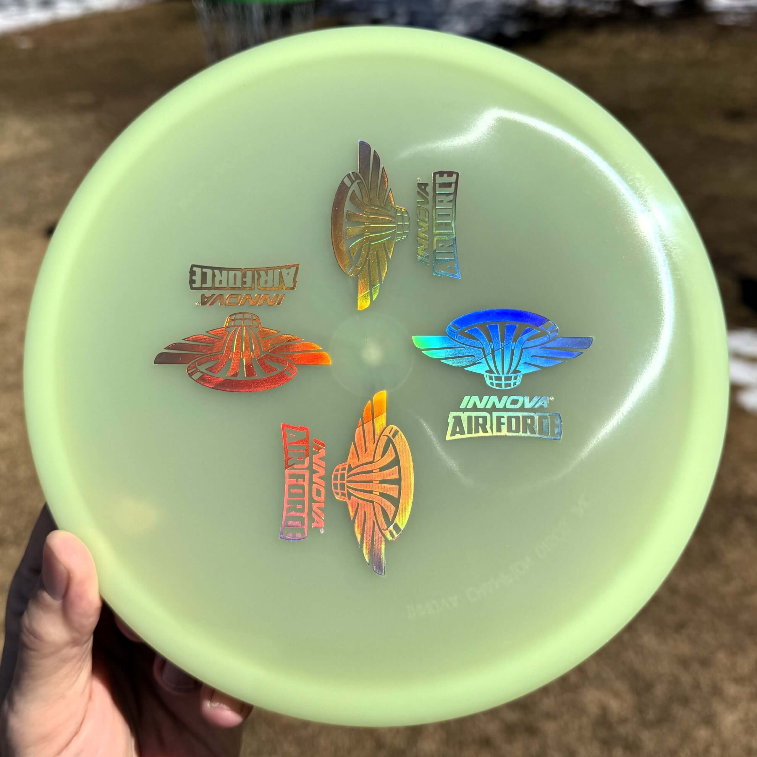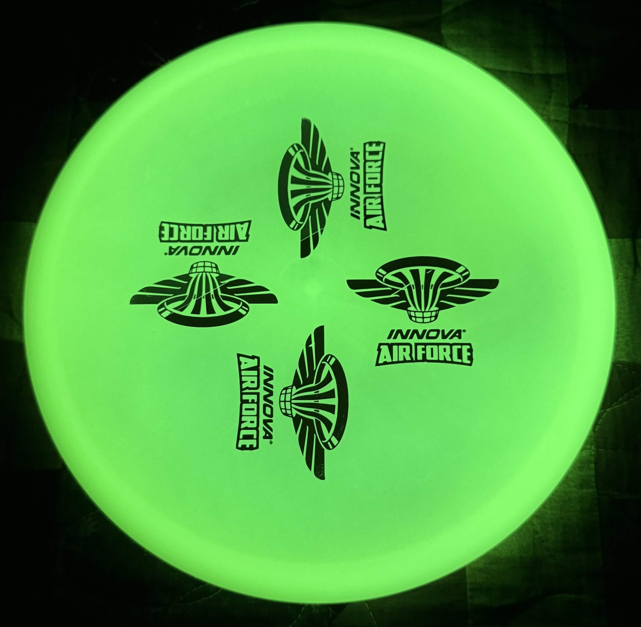Proto Glow Champion plastic! Innova’s new material glows brighter and lasts longer than previous materials while keeping the grip that Innova glow is known for.