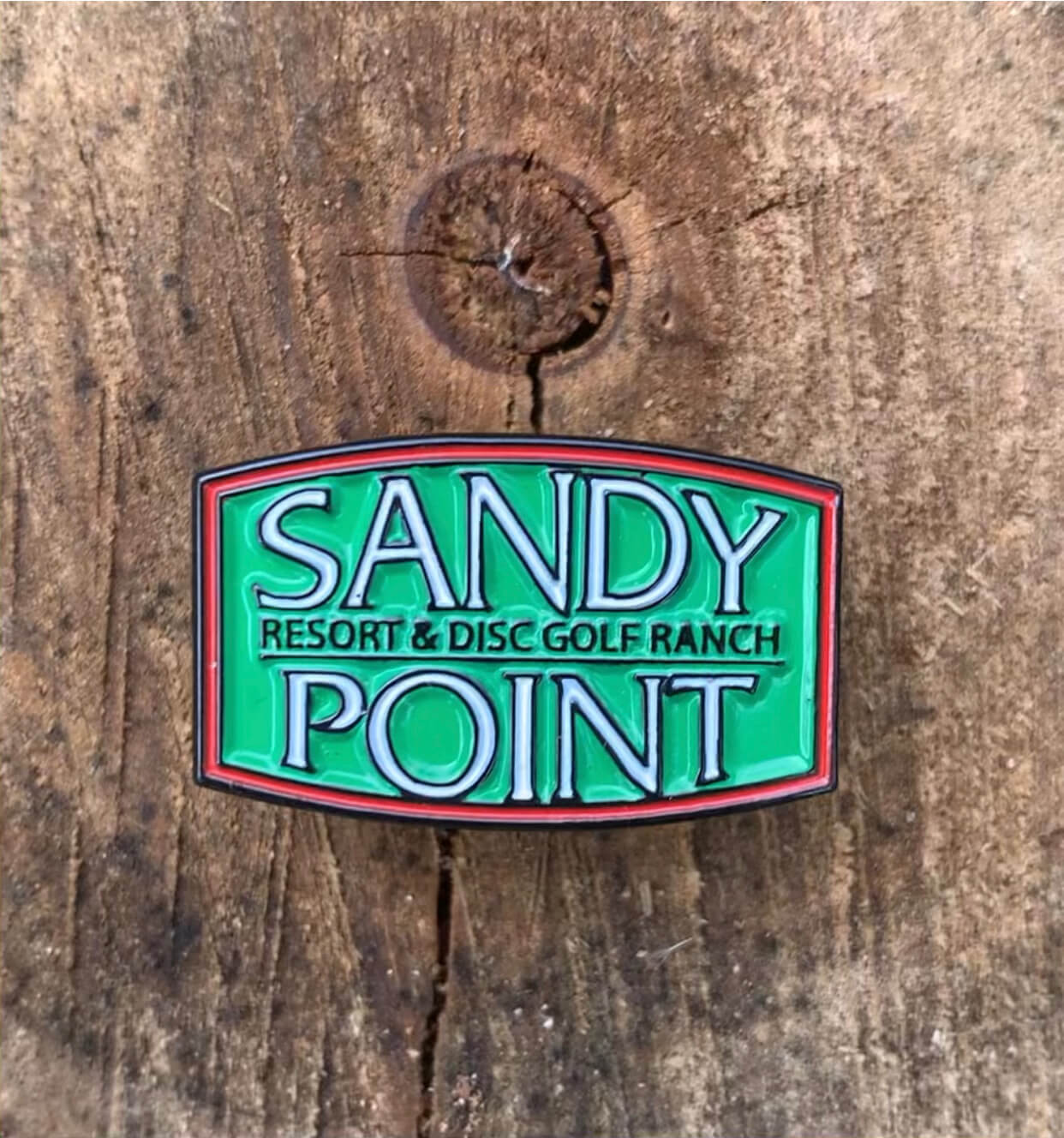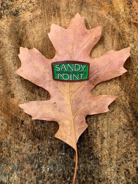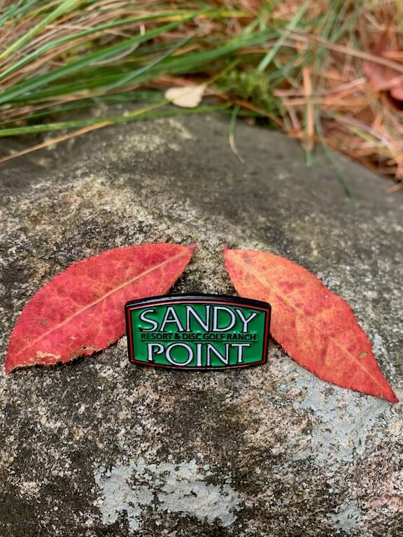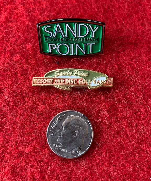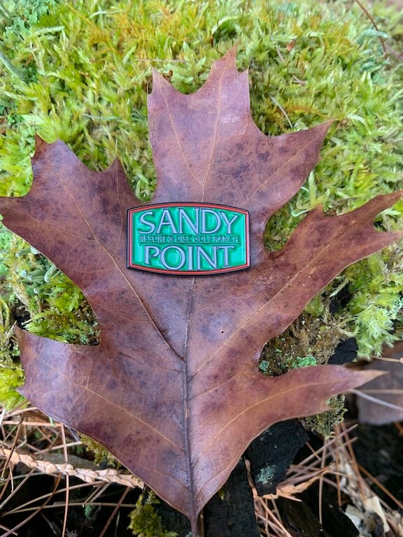 This Sandy Point green logo pin measures 1″
