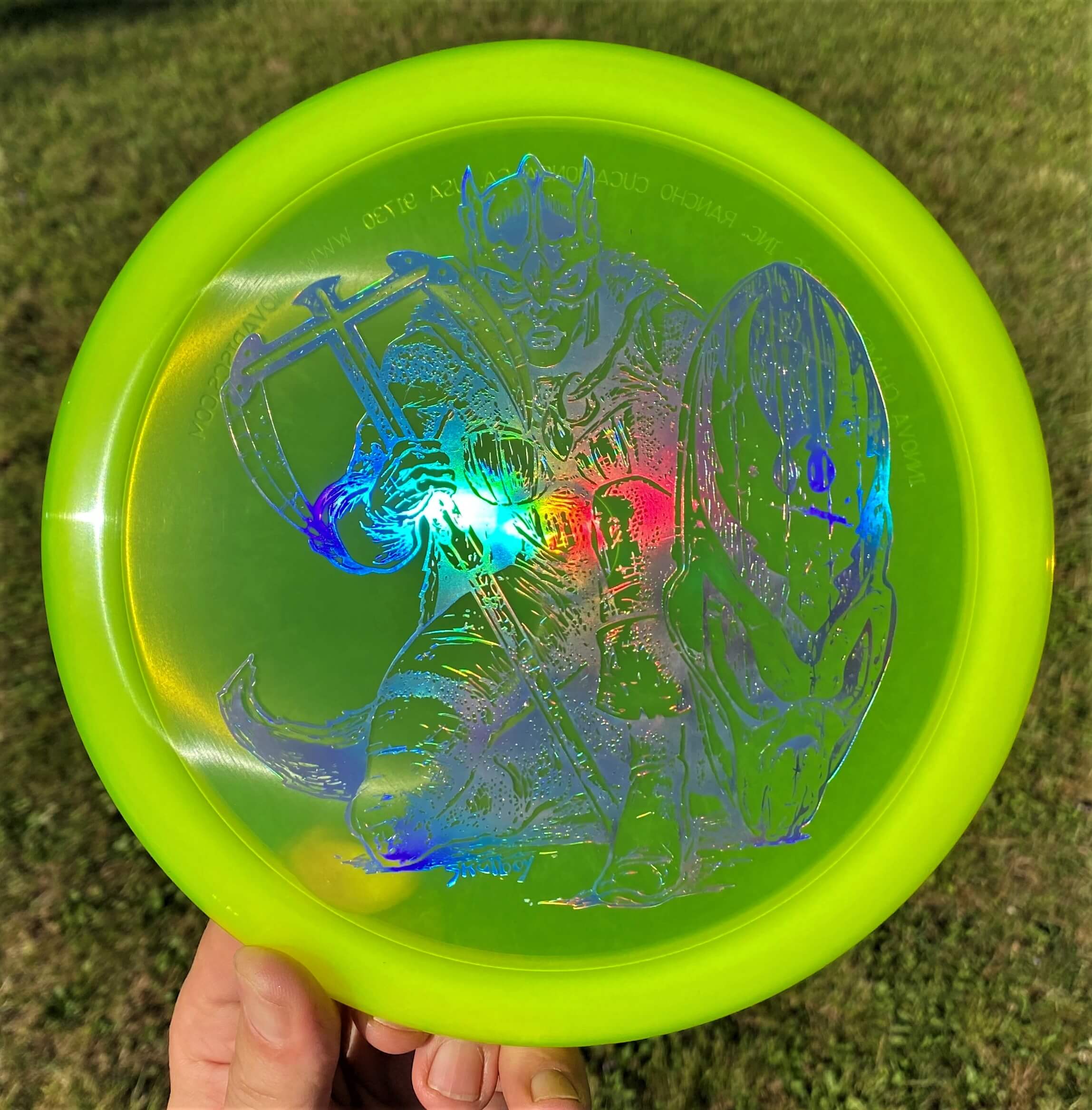 For the fourth installment of the Barbarian series from artist, Skulboy, Innova discs imagines the TeeBird in human form. Skulboy came up with a formidable huntress that could take down the biggest of foes. There’s lots of vintage TeeBird imagery here: The dagger-laden weapon is designed in the shape of a “T” and it also alludes to the old-school “Totem TeeBird” stamp as well as the later Echo Star TeeBird stamp that also featured a totem pole. Other aspects of the design–the shield, the cloak clasp, and the helmet–also shriek TeeBird.