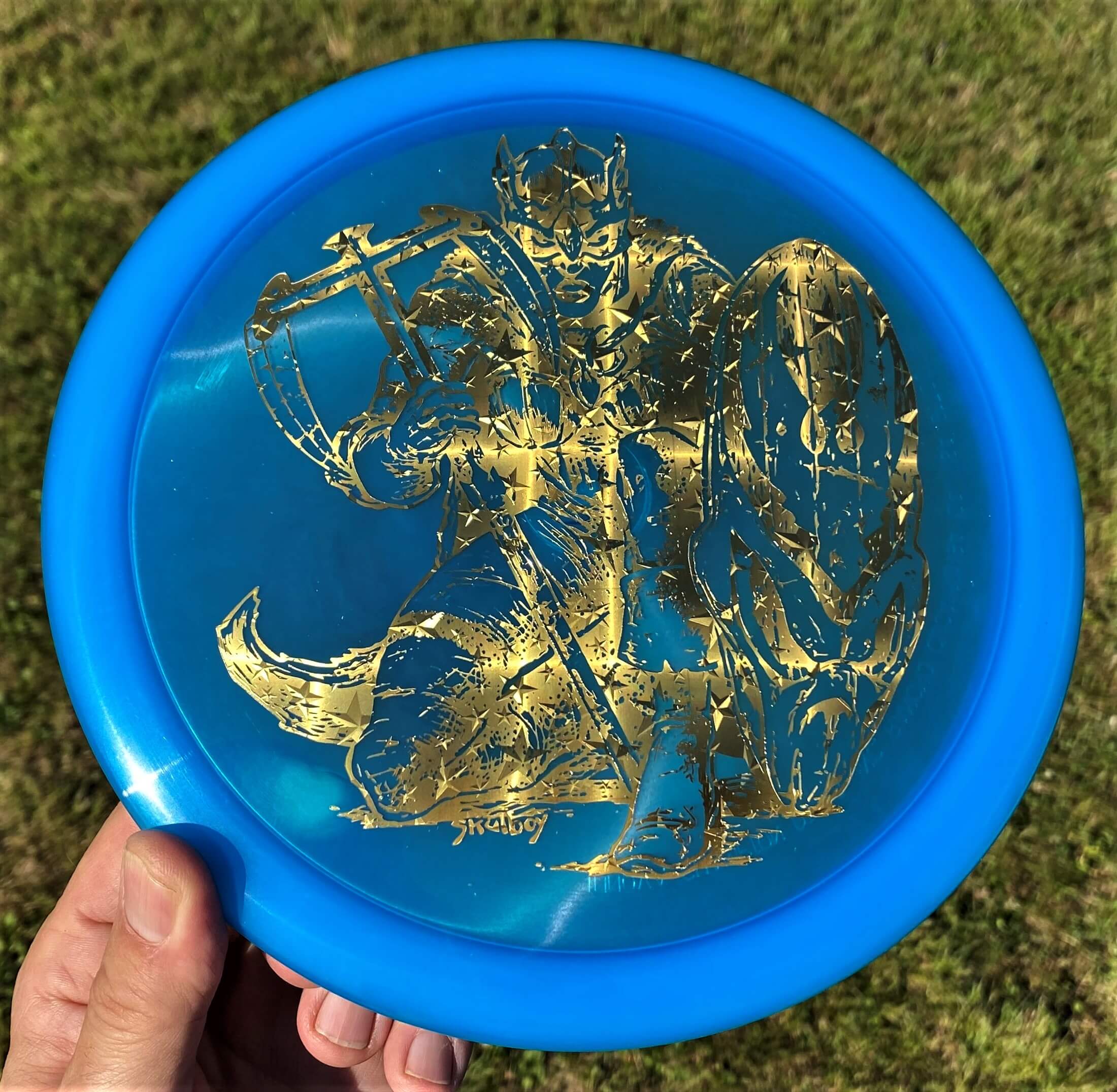 For the fourth installment of the Barbarian series from artist, Skulboy, Innova discs imagines the TeeBird in human form. Skulboy came up with a formidable huntress that could take down the biggest of foes. There’s lots of vintage TeeBird imagery here: The dagger-laden weapon is designed in the shape of a “T” and it also alludes to the old-school “Totem TeeBird” stamp as well as the later Echo Star TeeBird stamp that also featured a totem pole. Other aspects of the design–the shield, the cloak clasp, and the helmet–also shriek TeeBird.