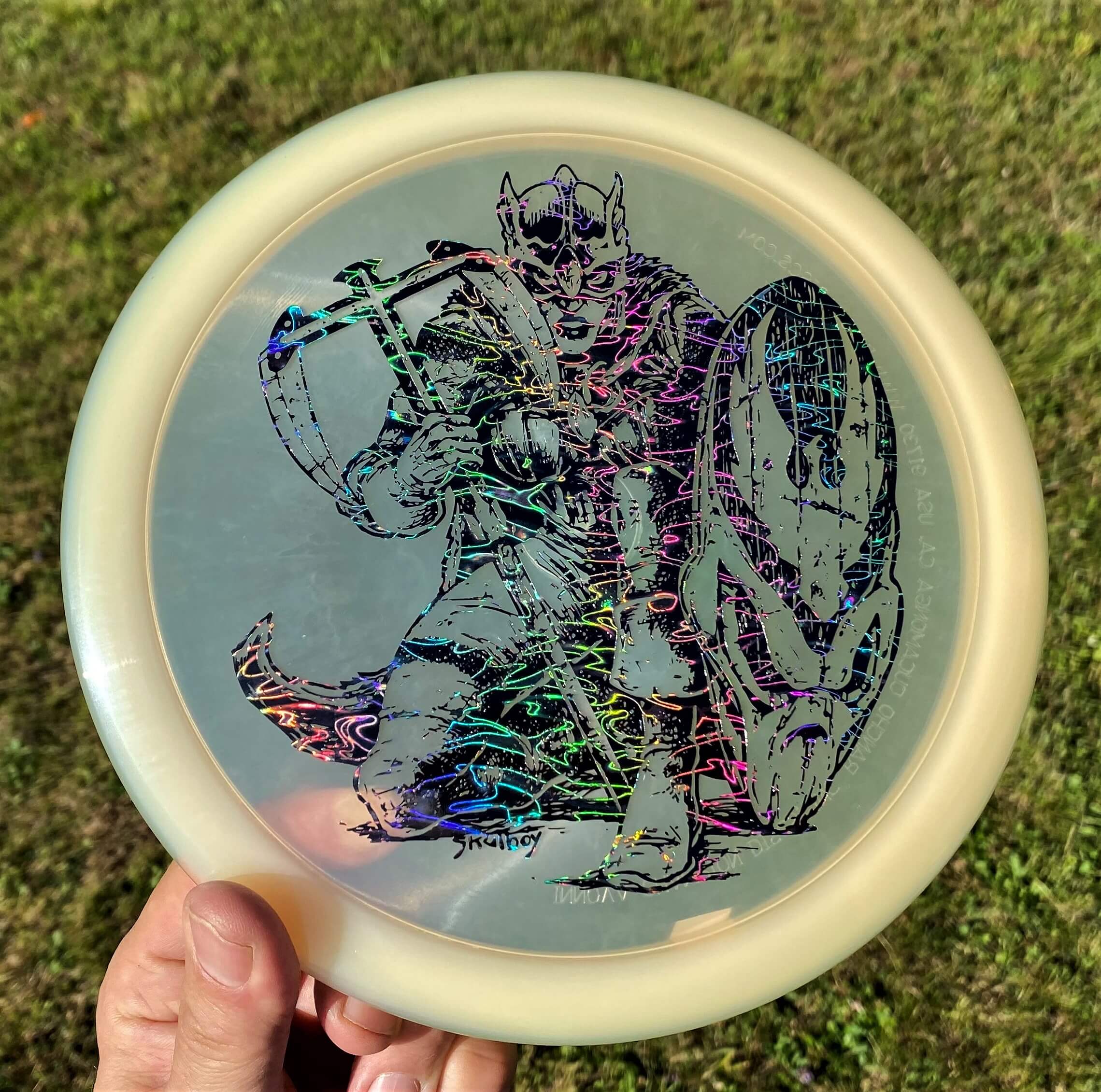 For the fourth installment of the Barbarian series from artist, Skulboy, Innova discs imagines the TeeBird in human form. Skulboy came up with a formidable huntress that could take down the biggest of foes. There’s lots of vintage TeeBird imagery here: The dagger-laden weapon is designed in the shape of a “T” and it also alludes to the old-school “Totem TeeBird” stamp as well as the later Echo Star TeeBird stamp that also featured a totem pole. Other aspects of the design–the shield, the cloak clasp, and the helmet–also shriek TeeBird.