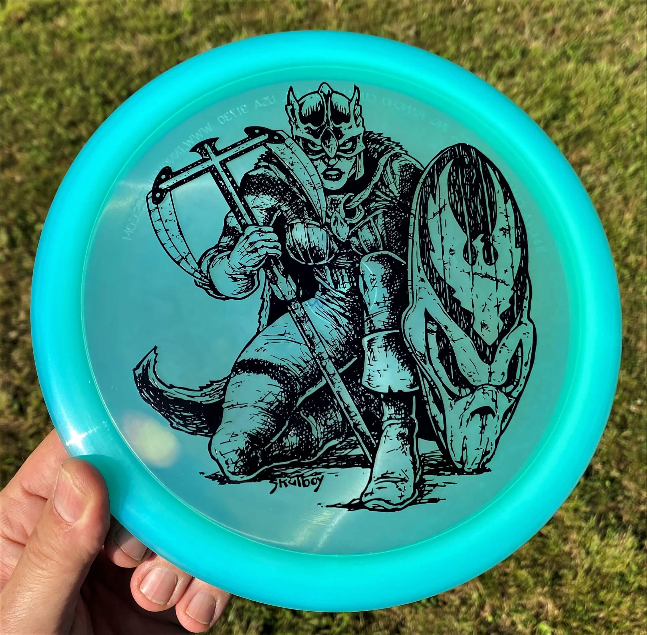 For the fourth installment of the Barbarian series from artist, Skulboy, Innova discs imagines the TeeBird in human form. Skulboy came up with a formidable huntress that could take down the biggest of foes. There’s lots of vintage TeeBird imagery here: The dagger-laden weapon is designed in the shape of a “T” and it also alludes to the old-school “Totem TeeBird” stamp as well as the later Echo Star TeeBird stamp that also featured a totem pole. Other aspects of the design–the shield, the cloak clasp, and the helmet–also shriek TeeBird.