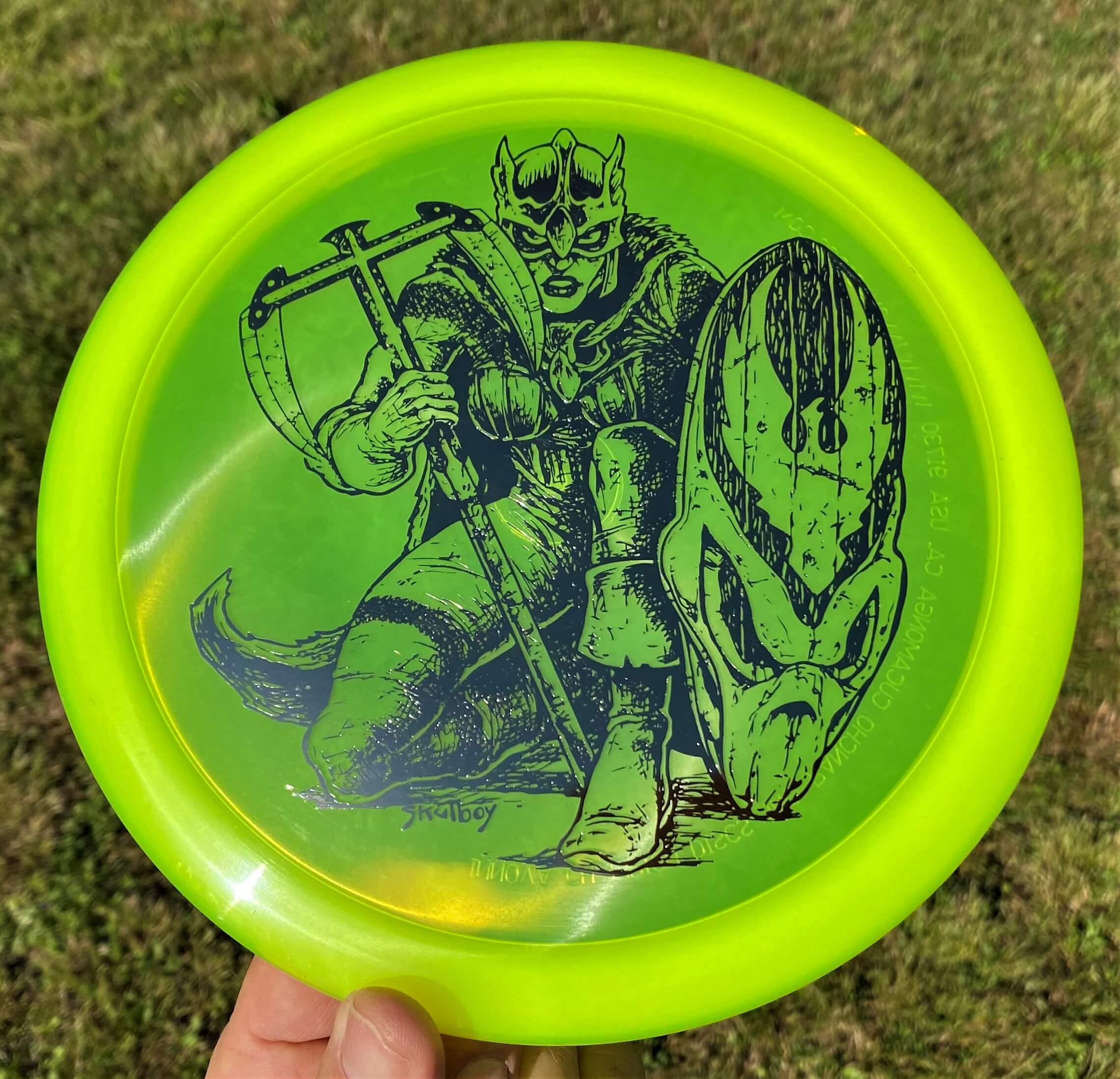 For the fourth installment of the Barbarian series from artist, Skulboy, Innova discs imagines the TeeBird in human form. Skulboy came up with a formidable huntress that could take down the biggest of foes. There’s lots of vintage TeeBird imagery here: The dagger-laden weapon is designed in the shape of a “T” and it also alludes to the old-school “Totem TeeBird” stamp as well as the later Echo Star TeeBird stamp that also featured a totem pole. Other aspects of the design–the shield, the cloak clasp, and the helmet–also shriek TeeBird.