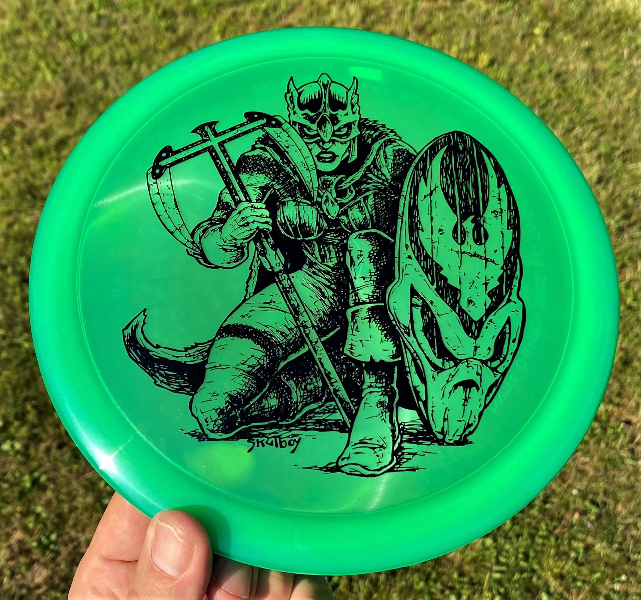 For the fourth installment of the Barbarian series from artist, Skulboy, Innova discs imagines the TeeBird in human form. Skulboy came up with a formidable huntress that could take down the biggest of foes. There’s lots of vintage TeeBird imagery here: The dagger-laden weapon is designed in the shape of a “T” and it also alludes to the old-school “Totem TeeBird” stamp as well as the later Echo Star TeeBird stamp that also featured a totem pole. Other aspects of the design–the shield, the cloak clasp, and the helmet–also shriek TeeBird.